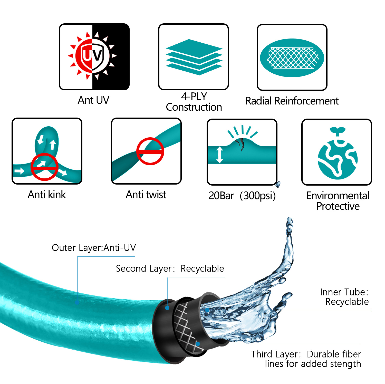 概要: 中型花园水管四季可以使用的理想产品,可用于家中使用。软管装甲的构造,使这种花园水管有能力保持 全年在任何温度下都灵活, 并允许您在使用水管时无需调整和回溯。软管抗扭结,并配有一个防护圈,可防止在管口处打结。关键区域的编织加固允许300 PSI的爆裂强度,并使用黄铜、无铅接头持续流动稳定的压力水。